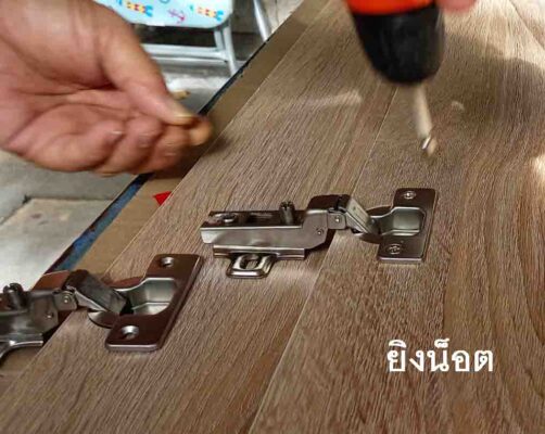 วิธีการติดตั้ง วางบนบานประตูและฝาตู้ และยิงน็อต ให้บานประตูสามารถเปิดปิดได้