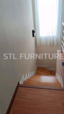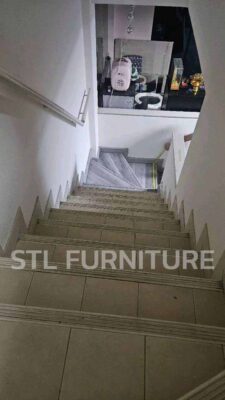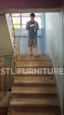 ขึ้นได้ค่ะ แต่กว่าจะขึ้นได้ก็ลุ้นพอสมควร เนื่องจากตู้ครัวใบนี้มีความยาว 150 cm ช่วงตรงเลี้ยวที่พักบันไดเกือบติด เราก็คาดคะเนแล้วว่าหากติดขึ้นไม่ได้ อาจต้องยกแบบคว่ำหัวลง ขาชี้ฟ้า เพราะช่วงหัวตู้ลึกน้อยกว่าช่วงล่าง บิดเลี้ยวได้สะดวกกว่า