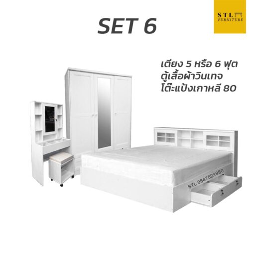 คอลเล็คชั่นใหม่ ชุดห้องนอน set 6 ชุดห้องนอนสีขาวสไตล์เกาหลี มาพร้อมกับเตียงดีไซน์ 5 ฟุต ลิ้นชักข้าง ตู้เสื้อผ้าทรงวินเทจ และโต๊ะเครื่องแป้งเกาหลี มาเนรมิตห้องนอนของคุณให้พิเศษ!