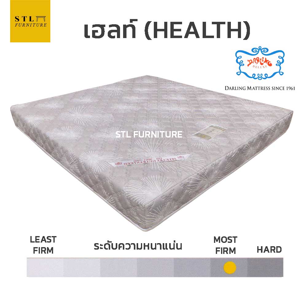 ที่นอนดาร์ลิ่ง Darling รุ่น Health ให้ความนุ่มของยางพารา แต่ไม่นุ่มจนเกินไปด้วยชั้นฟองน้ำวิทยาศาสตร์ ความหนาแน่นสูงอยู่ตรงกลาง และเสริมด้วยชั้นฟองน้ำที่ช่วยกระจายน้ำหนักและแรงกดทับ ทำให้ที่นอนมีความหนาแน่นไม่ยุบตัวเป็นแอ่ง