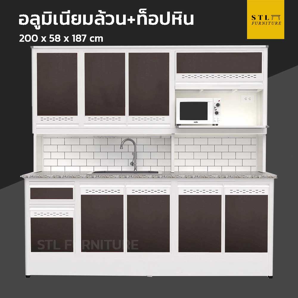 ตู้ครัวสำเร็จรูปมีอ่าง 1 หลุม อลูมิเนียมล้วน ท็อปหิน ขาทึบ 200 cm วางไมโครเวฟ