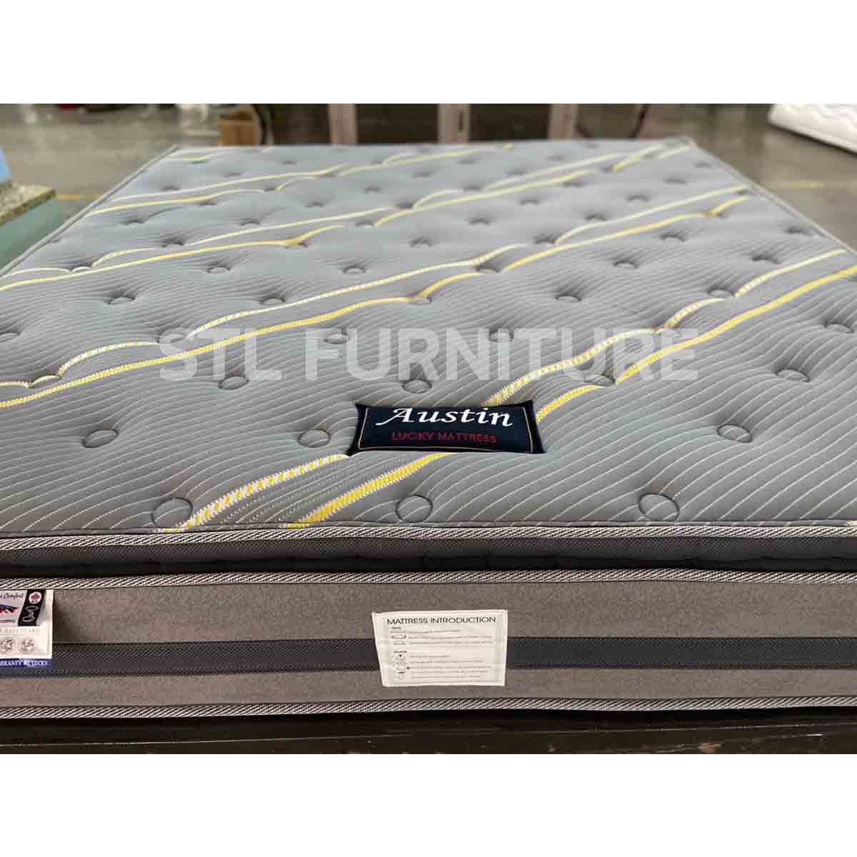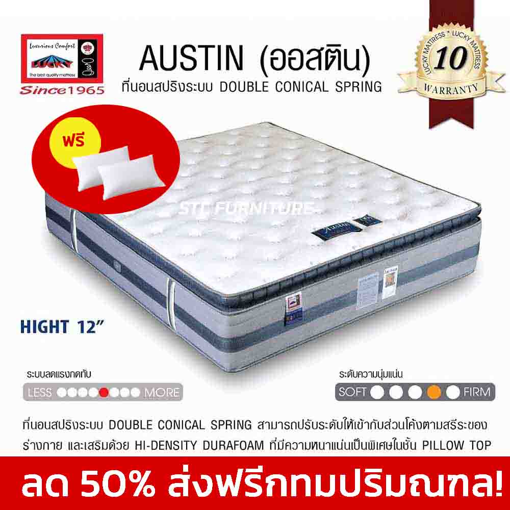 ที่นอนลัคกี้ Lucky รุ่น AUSTIN ที่นอนสปริงระบบ DOUBLE CONICAL SPRING สามารถปรับระดับให้เข้ากับส่วนโค้งตามสรีระของร่างกาย และเสริมด้วย HI-DENSITY ที่มีความหนาแน่นเป็นพิเศษในชั้น PILLOW TOP สามารถรองรับและกระจายน้ำหนักได้เป็นอย่างดี จึงเหมาะกับผู้ที่มีปัญหาปวดเมื่อยตามร่างกาย
