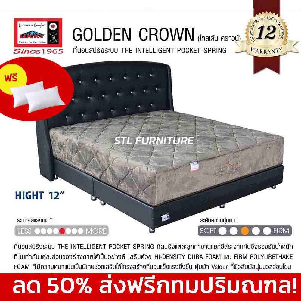 ที่นอนลัคกี้ Lucky รุ่น Golden Crown ที่นอนสปริงระบบ The Intelligent Pocket Spring ที่สปริงแต่ละลูกทำงานแยกอิสระจากกัน จึงรองรับน้ำหนักที่ไม่เท่ากันของแต่ละส่วนของร่างกายได้เป็นอย่างดี เสริมด้วย Hi-Density Dura Foam และ Firm Polyurethane Foam ที่มีความหนาแน่นเป็นพิเศษช่วยเสริมให้โครงสร้างที่นอนแข็งแรงยิ่งขึ้น หุ้มผ้า Valour ที่ผิวสัมพัสนุ่มนวลอ่อนโยนดังกำมะหยี่ ช่วยให้หลับสนิทสบายตลอดคืน