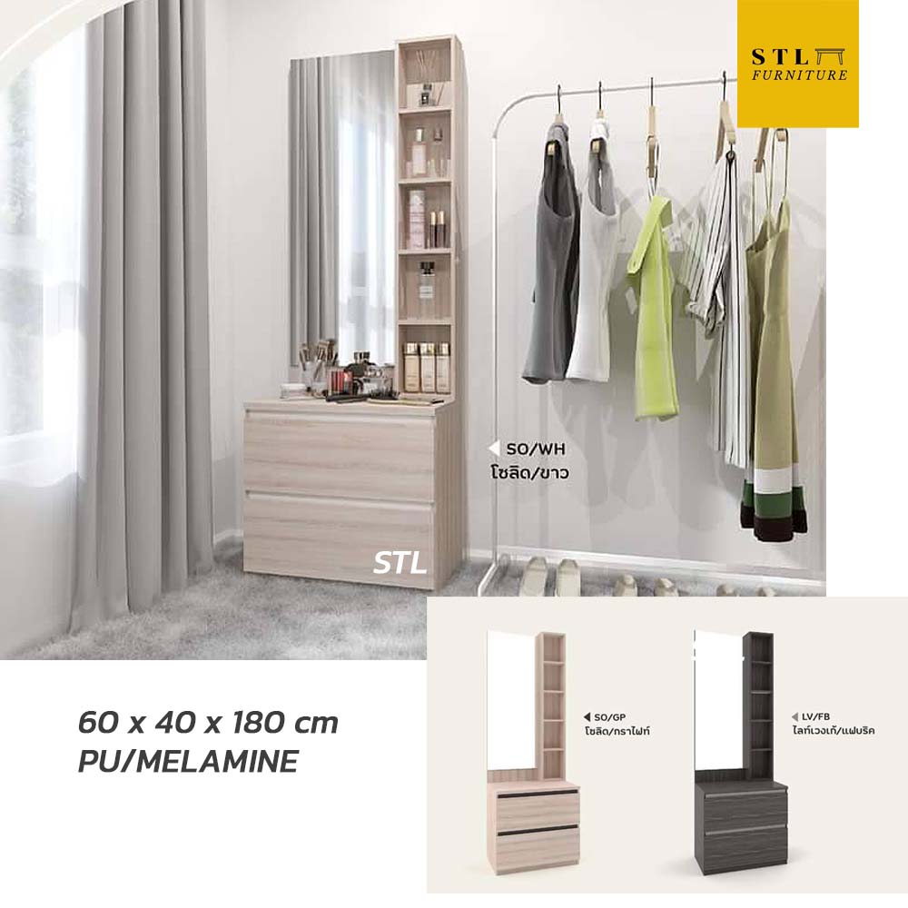 - ✅ โต๊ะแป้งยืน 2 ลิ้นชัก และ 5 ช่องใส่ของ